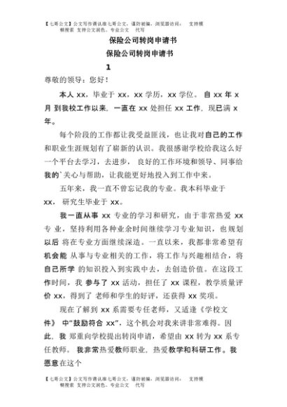 / 【七哥公文】2025年:保险公司转岗申请书+更多免费公文+VX:QiGeGongWen2024