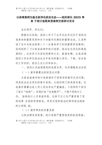 【七哥公文】2025年:以曲靖案例为鉴全面净化政治生态——组织部长2025年关于统计造假典型案例交流研讨发言+更多免费公文+VX:QiGeGongWen2024
