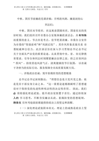 【七哥公文】2025年:中秋、国庆节前廉政党课讲稿:月明清风朗,廉韵润初心+更多免费公文+VX:QiGeGongWen2024