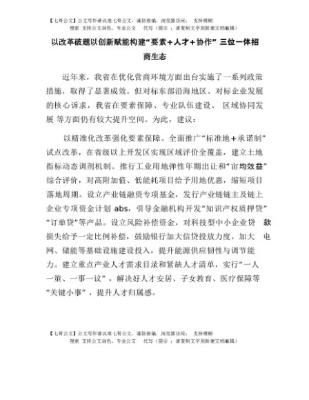 【七哥公文】2025年:以改革破题以创新赋能构建“要素+人才+协作”三位一体招商生态+更多免费公文+VX:QiGeGongWen2024