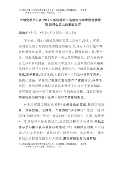 【七哥公文】2025年:中学党委书记在2025年区委第二巡察组巡察中学党委情况反馈会议上的表态发言+更多免费公文+VX:QiGeGongWen2024