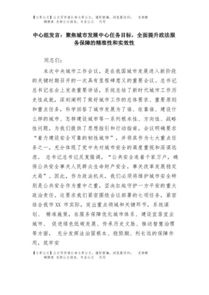 【七哥公文】2025年:中心组发言:聚焦城市发展中心任务目标,全面提升政法服务保障的精准性和实效性+更多免费公文+VX:QiGeGongWen2024