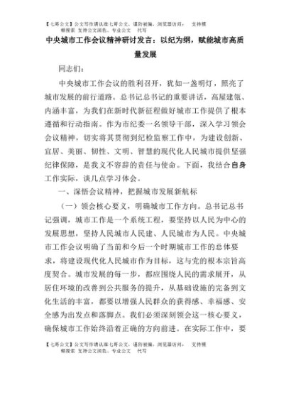 【七哥公文】2025年:中央城市工作会议精神研讨发言:以纪为纲,赋能城市高质量发展+更多免费公文+VX:QiGeGongWen2024
