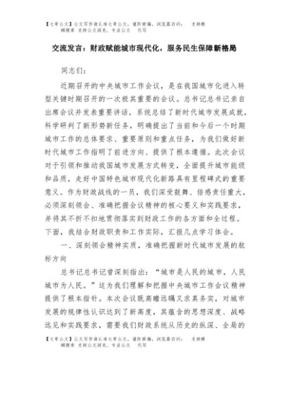 【七哥公文】2025年:交流发言:财政赋能城市现代化,服务民生保障新格局+更多免费公文+VX:QiGeGongWen2024