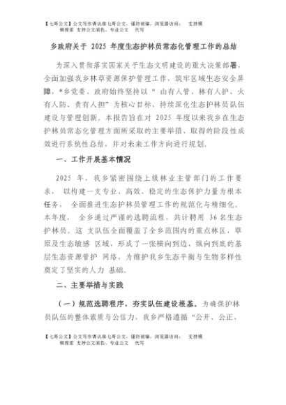 【七哥公文】2025年:乡政府关于2025年度生态护林员常态化管理工作的总结+更多免费公文+VX:QiGeGongWen2024