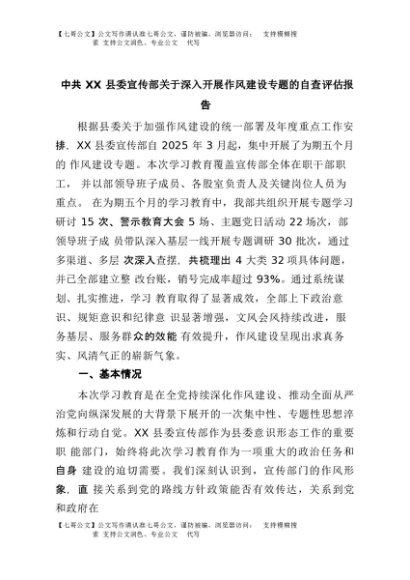 【七哥公文】2025年:中共XX县委宣传部关于深入开展作风建设专题的自查评估报告+更多免费公文+VX:QiGeGongWen2024
