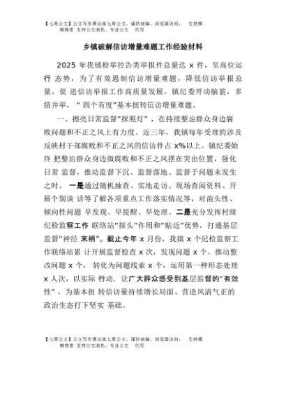 / 【七哥公文】2025年:乡镇破解信访增量难题工作经验材料+更多免费公文+VX:QiGeGongWen2024
