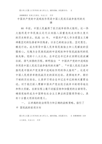 【七哥公文】2025年:中国共产党的中流砥柱作用是中国人民抗日战争胜利的关键+更多免费公文+VX:QiGeGongWen2024