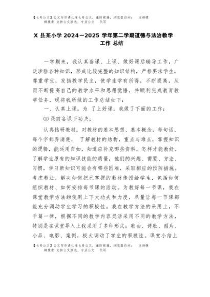 【七哥公文】2025年:X县某小学2024-2025学年第二学期道德与法治教学工作总结+更多免费公文+VX:QiGeGongWen2024