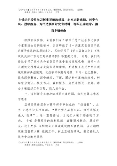 【七哥公文】2025年:乡镇组织委员学习树牢正确政绩观,树牢宗旨意识,转变作风、履职担当、为民造福研讨发言材料:树牢正确理念,担当乡镇使命+更多免费公文+VX:QiGeGongWen2024
