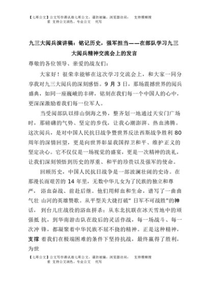 【七哥公文】2025年:九三大阅兵演讲稿:铭记历史,强军担当——在部队学习九三大阅兵精神交流会上的发言+更多免费公文+VX:QiGeGongWen2024