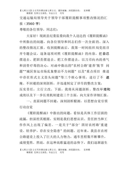 【七哥公文】2025年:交通运输局领导关于领导干部履职提醒事项整改情况的汇报(3560字)+更多免费公文+VX:QiGeGongWen2024