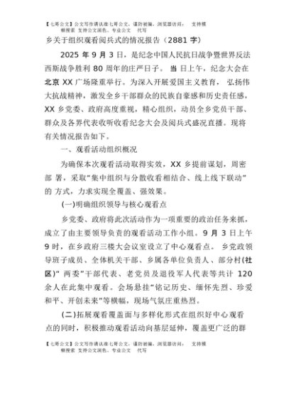 / 【七哥公文】2025年:乡关于组织观看阅兵式的情况报告(2881字)+更多免费公文+VX:QiGeGongWen2024