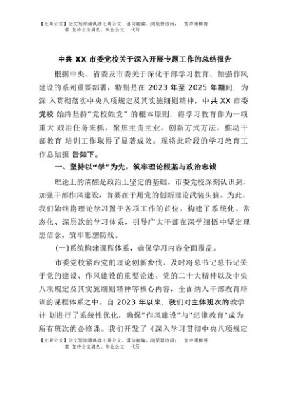 / 【七哥公文】2025年:中共XX市委党校关于深入开展专题工作的总结报告+更多免费公文+VX:QiGeGongWen2024