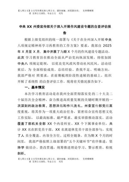 【七哥公文】2025年:中共XX州委宣传部关于深入开展作风建设专题的自查评估报告+更多免费公文+VX:QiGeGongWen2024