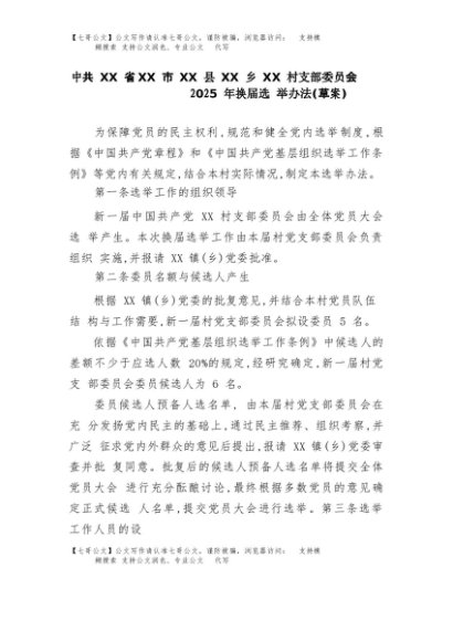 【七哥公文】2025年:中共XX省XX市XX县XX乡XX村支部委员会2025年换届选举办法(草案)+更多免费公文+VX:QiGeGongWen2024