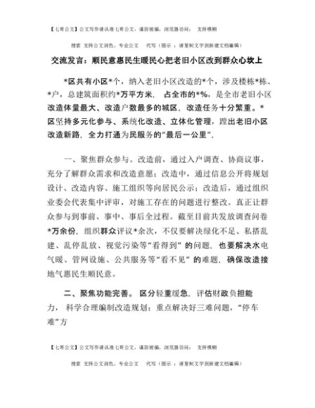 【七哥公文】2025年:交流发言:顺民意 惠民生 暖民心 把老旧小区改到群众心坎上+更多免费公文+VX:QiGeGongWen2024