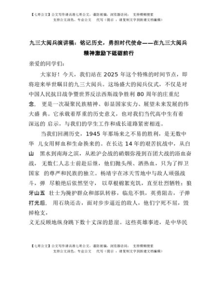 【七哥公文】2025年:九三大阅兵演讲稿:铭记历史,勇担时代使命——在九三大阅兵精神激励下砥砺前行+更多免费公文+VX:QiGeGongWen2024