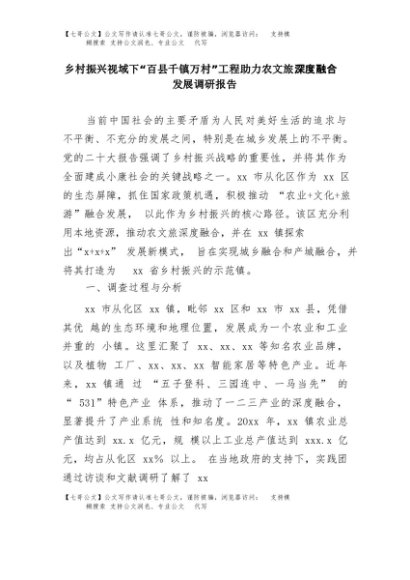 【七哥公文】2025年:乡村振兴视域下“百县千镇万村”工程助力农文旅深度融合发展调研报告+更多免费公文+VX:QiGeGongWen2024