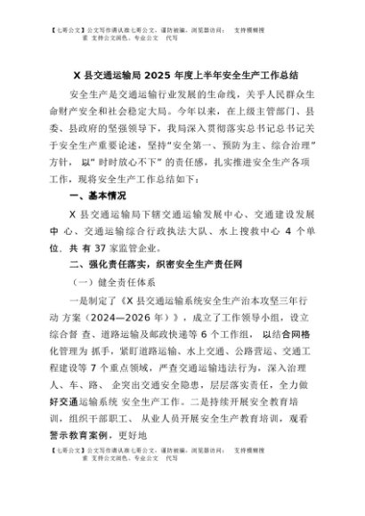 【七哥公文】2025年:X县交通运输局2025年度上半年安全生产工作总结+更多免费公文+VX:QiGeGongWen2024