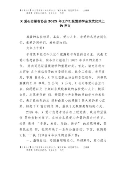 【七哥公文】2025年:X爱心志愿者协会2025年工作汇报暨助学金发放仪式上的发言+更多免费公文+VX:QiGeGongWen2024