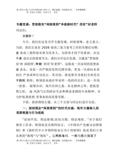 【七哥公文】2025年:专题党课:贯彻落实“两部准则”争做新时代“四有”好老师+更多免费公文+VX:QiGeGongWen2024