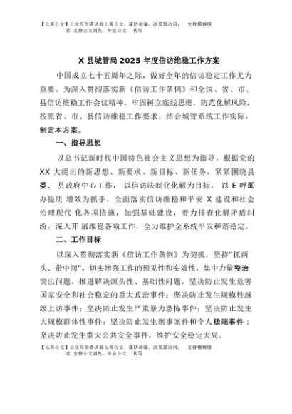/ 【七哥公文】2025年:X县城管局2025年度信访维稳工作方案+更多免费公文+VX:QiGeGongWen2024