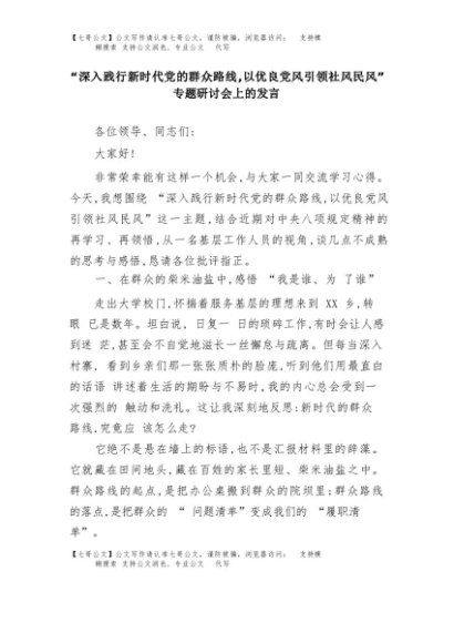 【七哥公文】2025年:“深入践行新时代党的群众路线,以优良党风引领社风民风”专题研讨会上的发言+更多免费公文+VX:QiGeGongWen2024