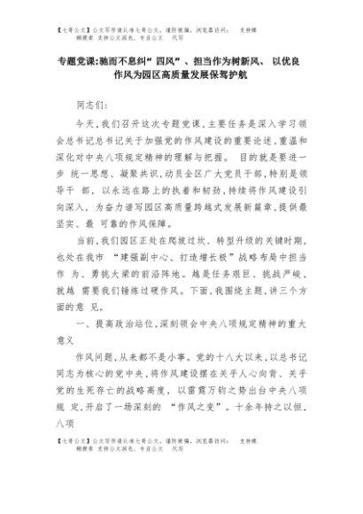 【七哥公文】2025年:专题党课:驰而不息纠“四风”、担当作为树新风、以优良作风为园区高质量发展保驾护航+更多免费公文+VX:QiGeGongWen2024