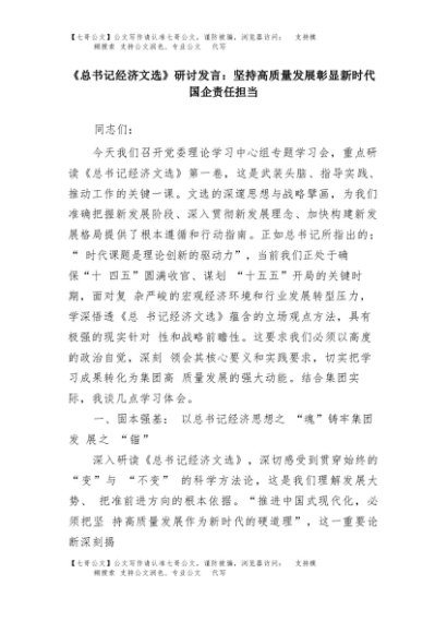 【七哥公文】2025年:《总书记经济文选》研讨发言:坚持高质量发展彰显新时代国企责任担当+更多免费公文+VX:QiGeGongWen2024