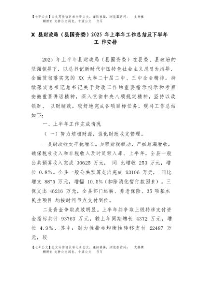 【七哥公文】2025年:X县财政局(县国资委)2025年上半年工作总结及下半年工作安排+更多免费公文+VX:QiGeGongWen2024