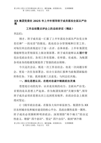 【七哥公文】2025年:XX集团党委在2025年上半年领导班子成员落实全面从严治党工作总结暨点评会上的总结讲话(精品)+更多免费公文+VX:QiGeGongWen2024