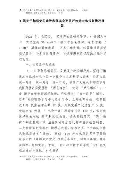 【七哥公文】2025年:X镇关于加强党的建设和落实全面从严治党主体责任情况报告+更多免费公文+VX:QiGeGongWen2024