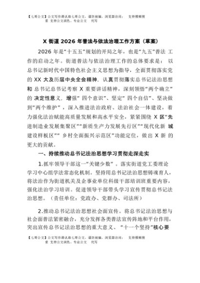 / 【七哥公文】2025年:X街道2026年普法与依法治理工作方案(草案)+更多免费公文+VX:QiGeGongWen2024