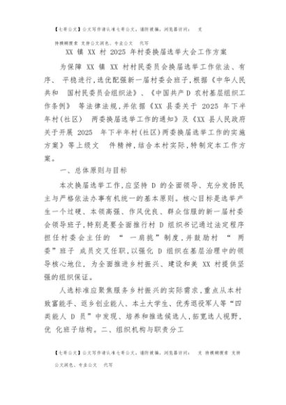 / 【七哥公文】2025年:XX镇XX村2025年村委换届选举大会工作方案+更多免费公文+VX:QiGeGongWen2024