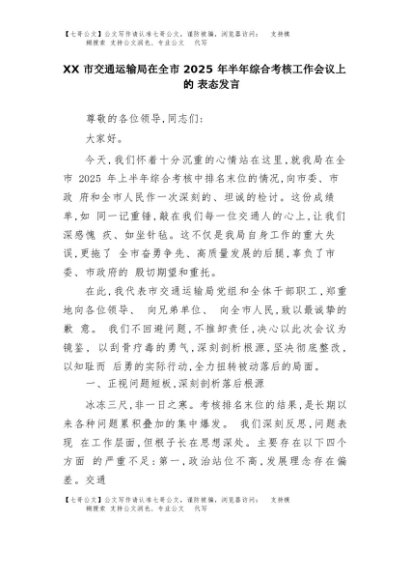 【七哥公文】2025年:XX市交通运输局在全市2025年半年综合考核工作会议上的表态发言+更多免费公文+VX:QiGeGongWen2024