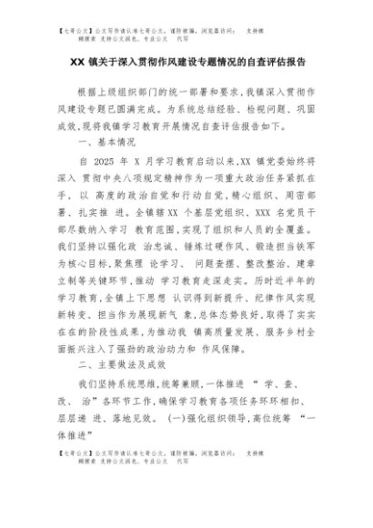 【七哥公文】2025年:XX镇关于深入贯彻作风建设专题情况的自查评估报告+更多免费公文+VX:QiGeGongWen2024