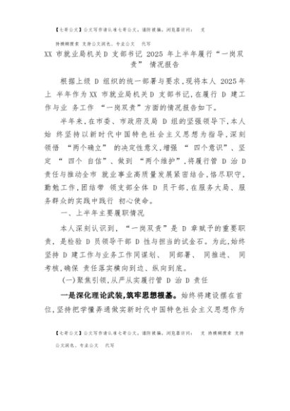 【七哥公文】2025年:XX市就业局机关党支部书记2025年上半年履行一岗双责情况报告+更多免费公文+VX:QiGeGongWen2024