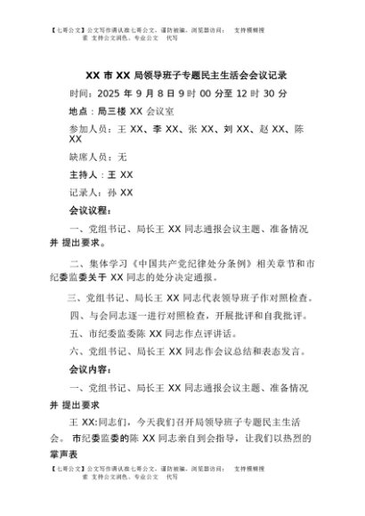 / 【七哥公文】2025年:XX市XX局领导班子专题民主生活会会议记录+更多免费公文+VX:QiGeGongWen2024