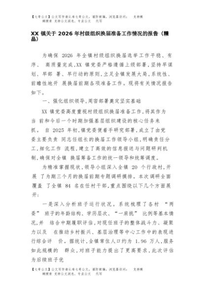 【七哥公文】2025年:XX镇关于2026年村级组织换届准备工作情况的报告(精品)+更多免费公文+VX:QiGeGongWen2024