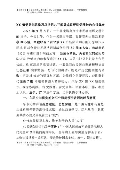 【七哥公文】2025年:XX镇党委书记学习总书记九三阅兵式重要讲话精神的心得体会+更多免费公文+VX:QiGeGongWen2024