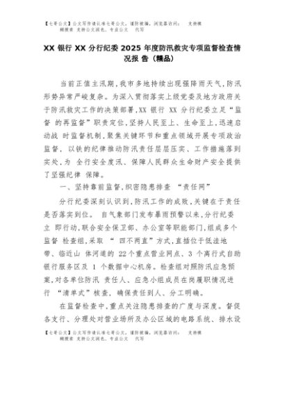 【七哥公文】2025年:XX银行XX分行纪委2025年度防汛救灾专项监督检查情况报告(精品)+更多免费公文+VX:QiGeGongWen2024