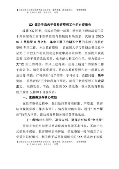 / 【七哥公文】2025年:XX镇关于宗教干部教育整顿工作的自查报告+更多免费公文+VX:QiGeGongWen2024