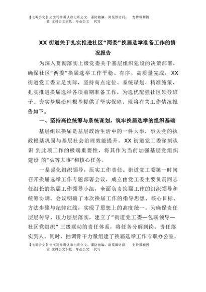 【七哥公文】2025年:XX街道关于扎实推进社区“两委”换届选举准备工作的情况报告+更多免费公文+VX:QiGeGongWen2024
