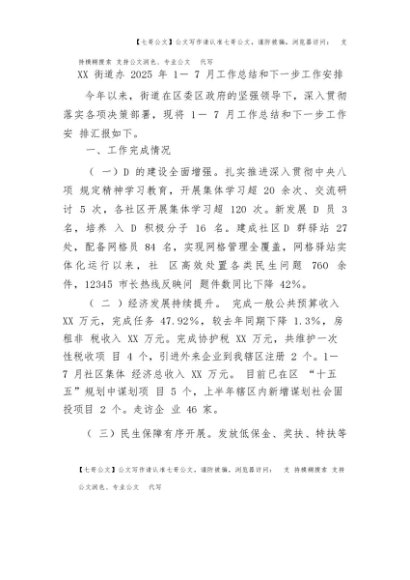 【七哥公文】2025年:XX街道办2025年1-7月工作总结和下一步工作安排+更多免费公文+VX:QiGeGongWen2024