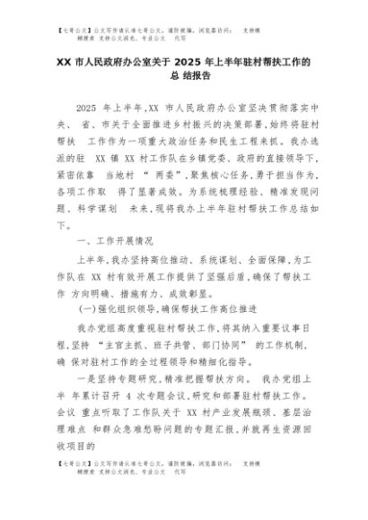 【七哥公文】2025年:XX市人民政府办公室关于2025年上半年驻村帮扶工作的总结报告+更多免费公文+VX:QiGeGongWen2024