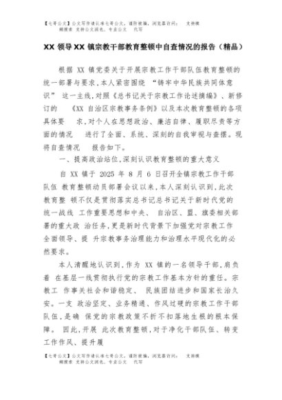 【七哥公文】2025年:XX领导XX镇宗教干部教育整顿中自查情况的报告(精品)+更多免费公文+VX:QiGeGongWen2024