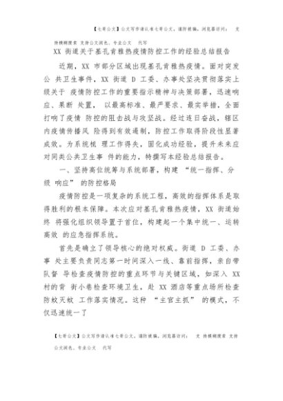【七哥公文】2025年:XX街道关于基孔肯雅热疫情防控工作的经验总结报告+更多免费公文+VX:QiGeGongWen2024