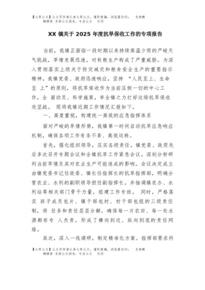 / 【七哥公文】2025年:XX镇关于2025年度抗旱保收工作的专项报告+更多免费公文+VX:QiGeGongWen2024