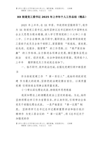【七哥公文】2025年:XX街道党工委书记2025年上半年个人工作总结(精品)+更多免费公文+VX:QiGeGongWen2024